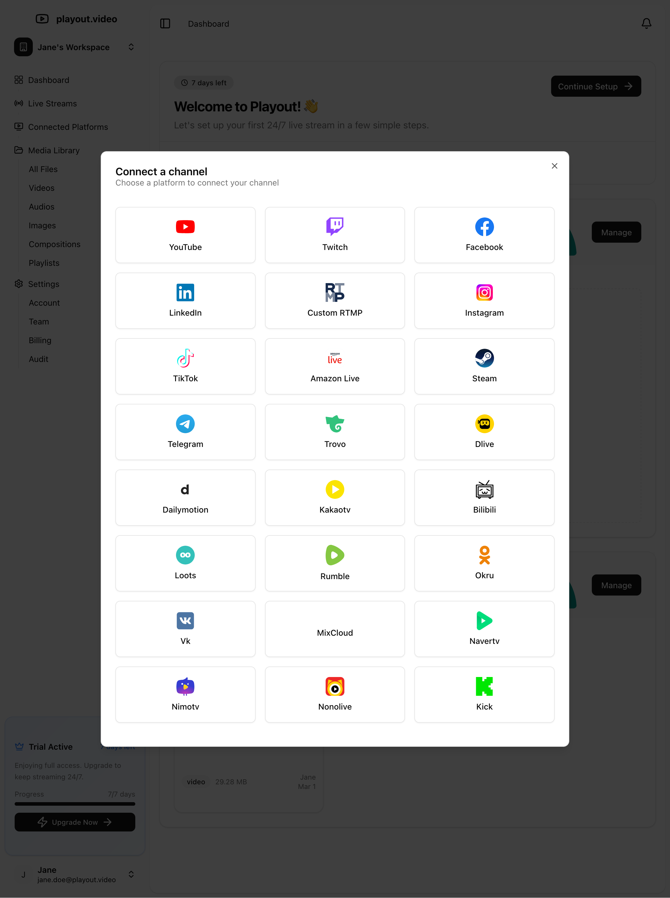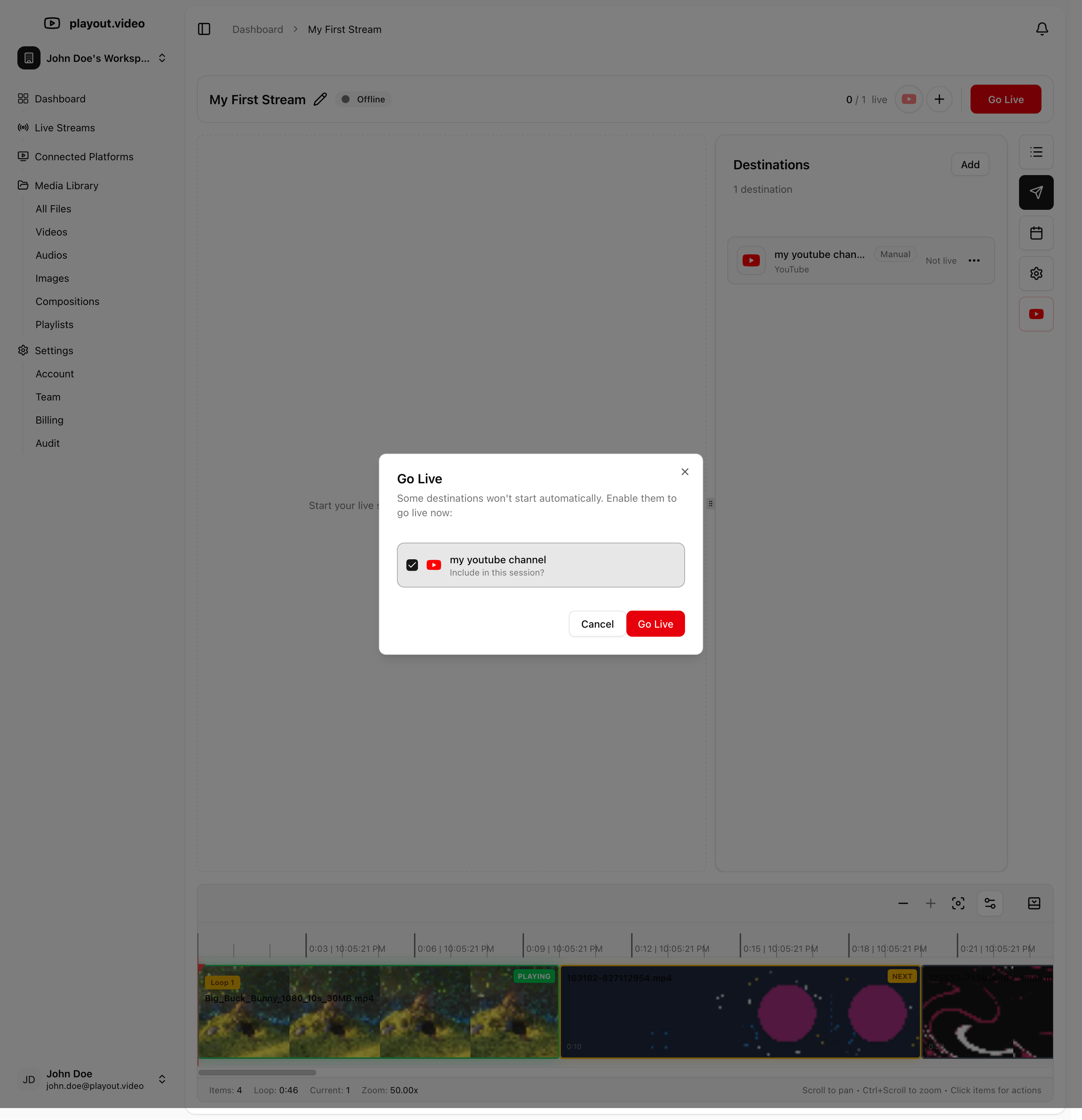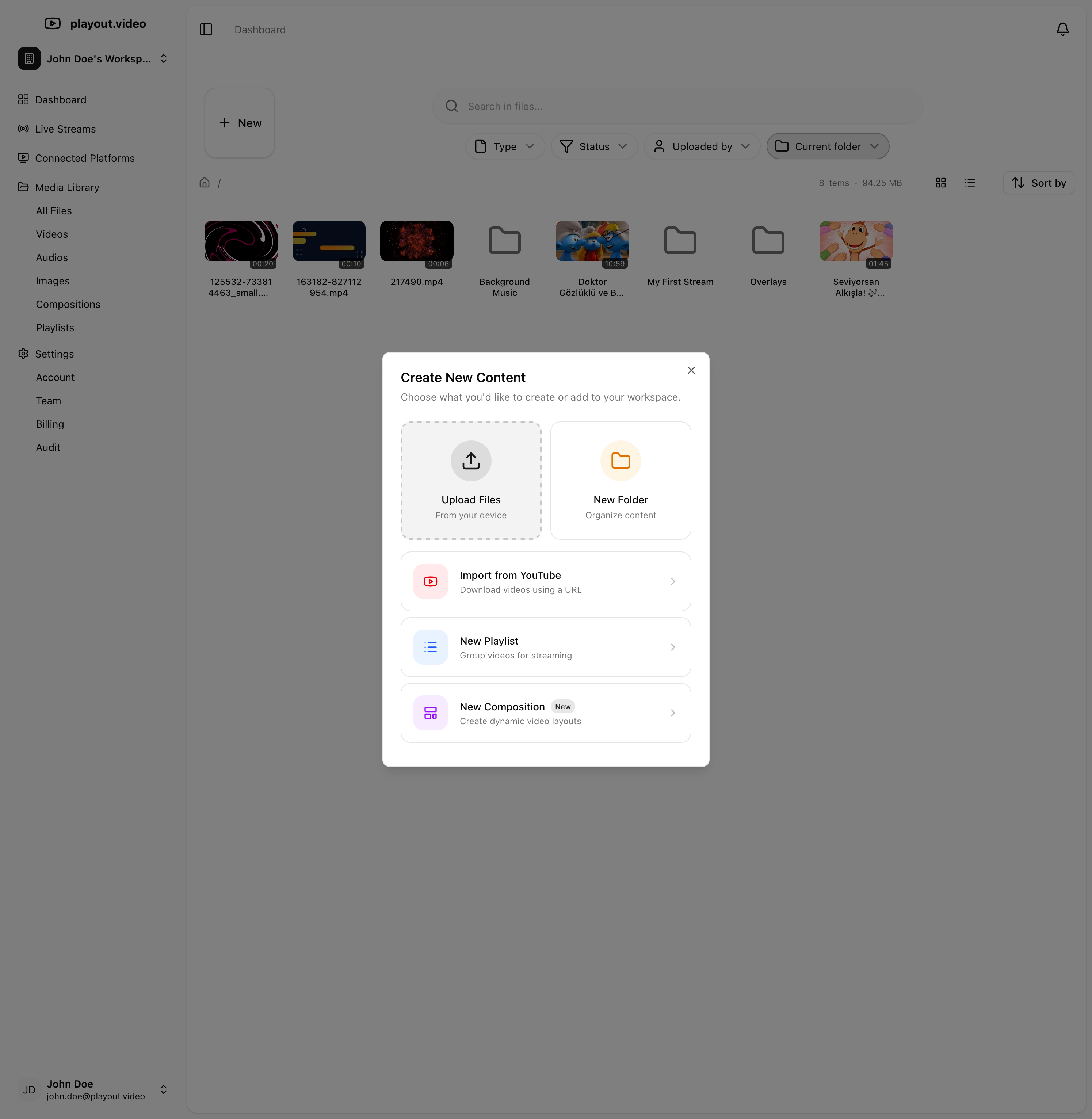 Head to playout.video and create your account. Once signed in, you'll land on the Dashboard, your central hub for managing live streams and media.