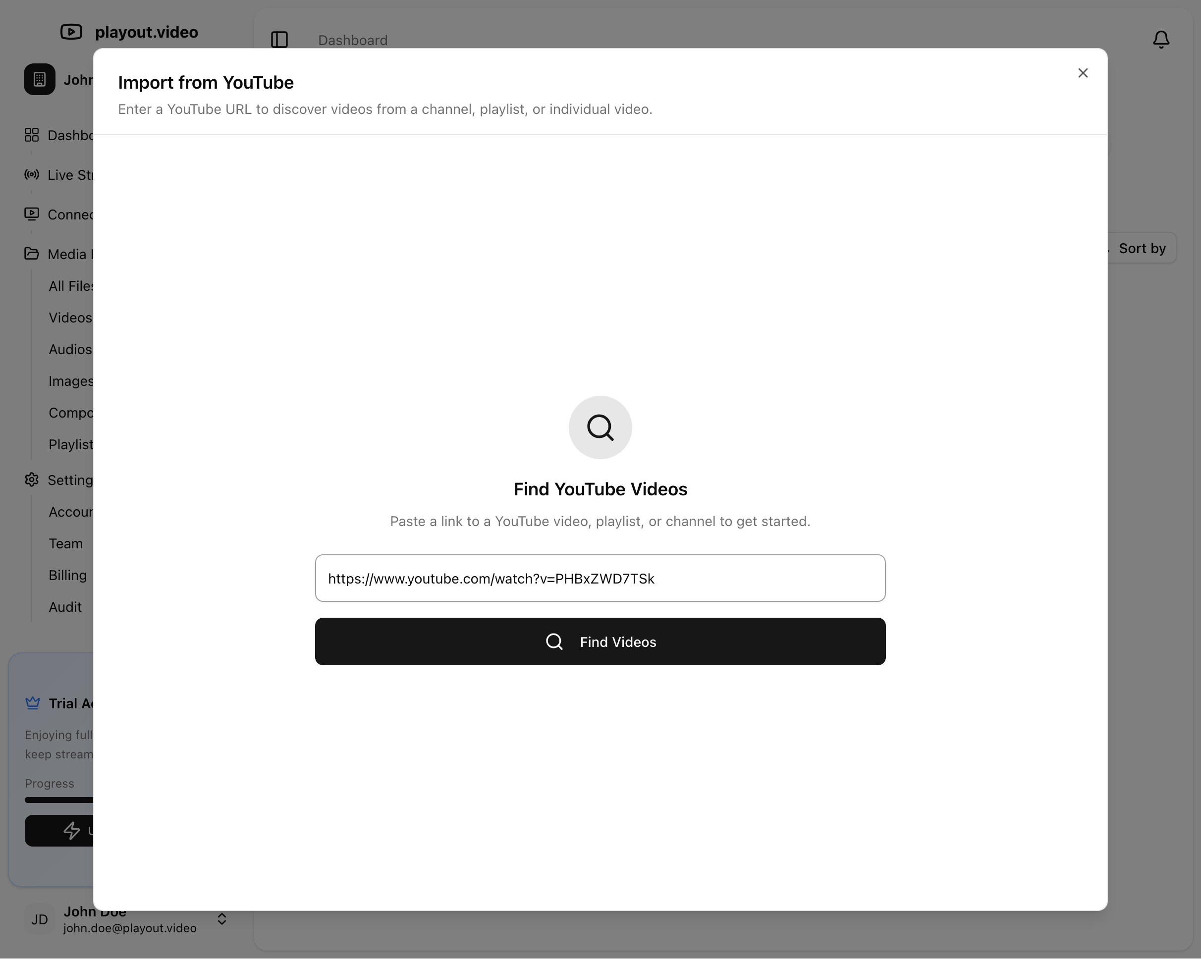 Import your existing YouTube videos into playout.video with one click. Build your media library instantly without re-uploading files.