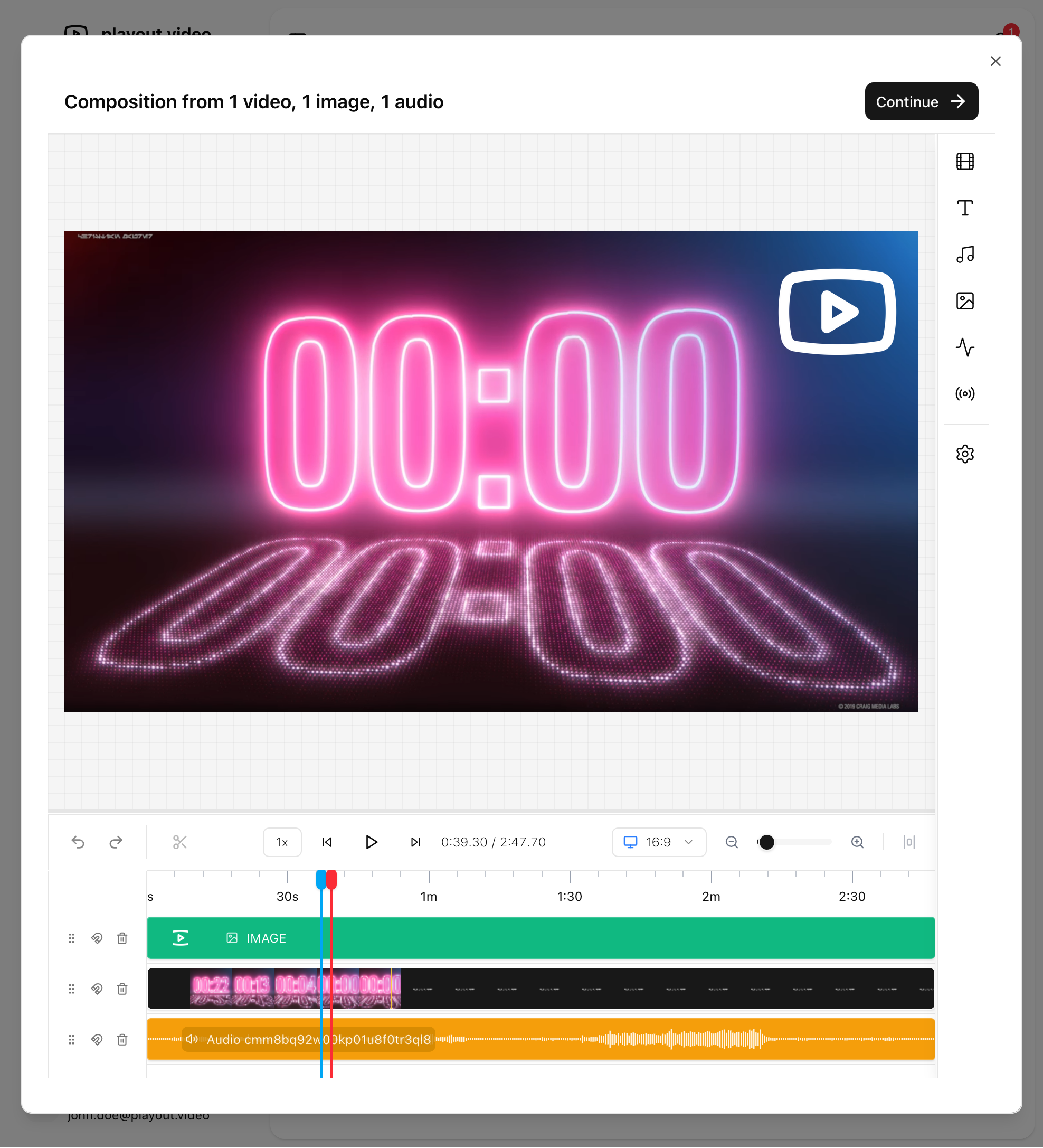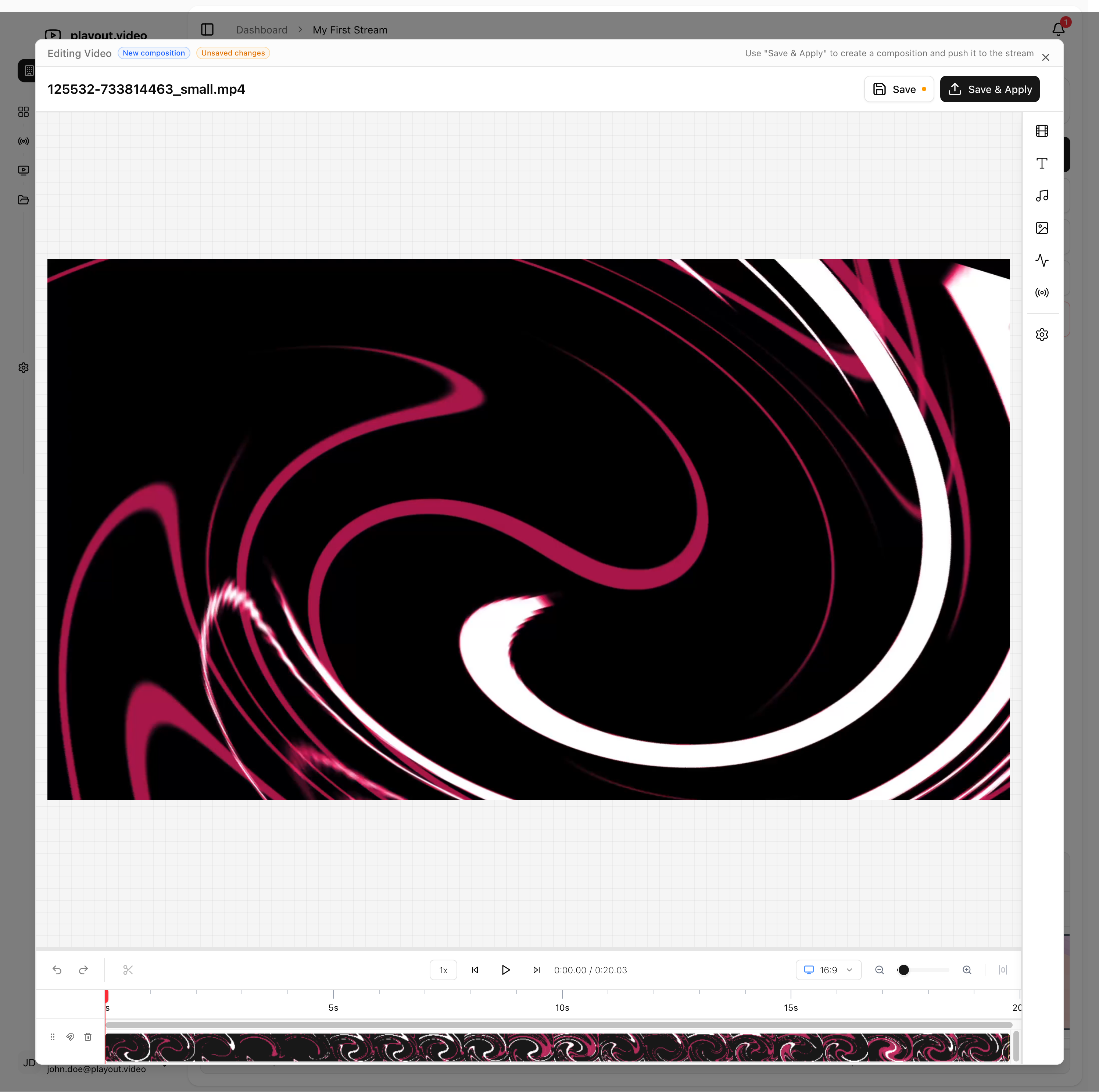 The Composition Editor is playout.video's built-in visual editor for creating overlay-rich video segments for your live stream. You can add logos, text, captions, stickers, audio visualizers, now-playing displays, and more: all without any design software or technical skills.