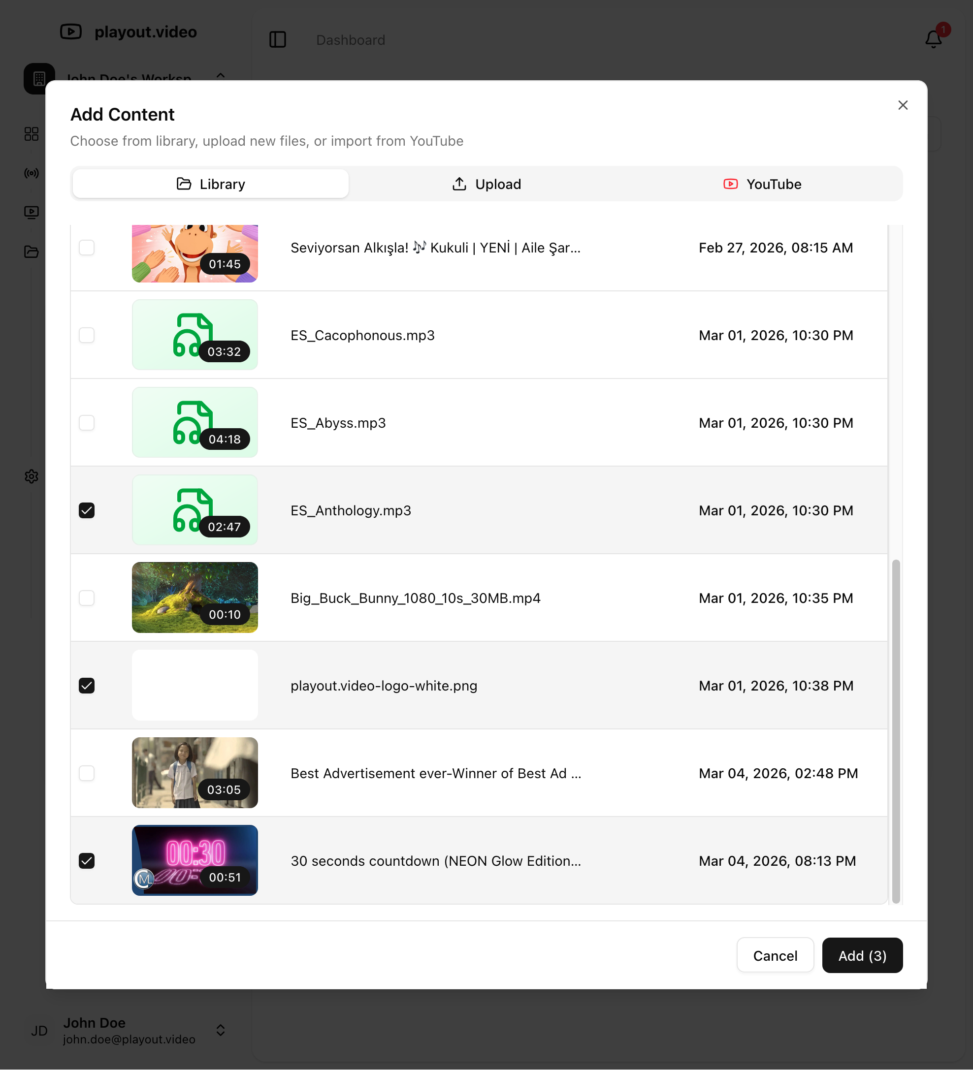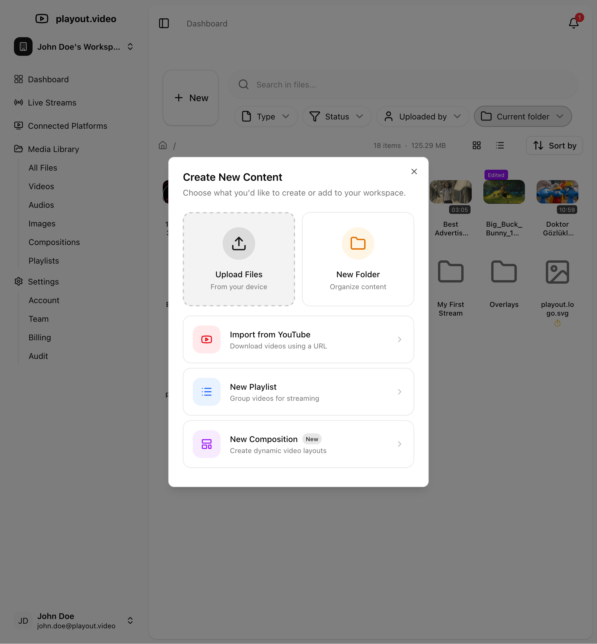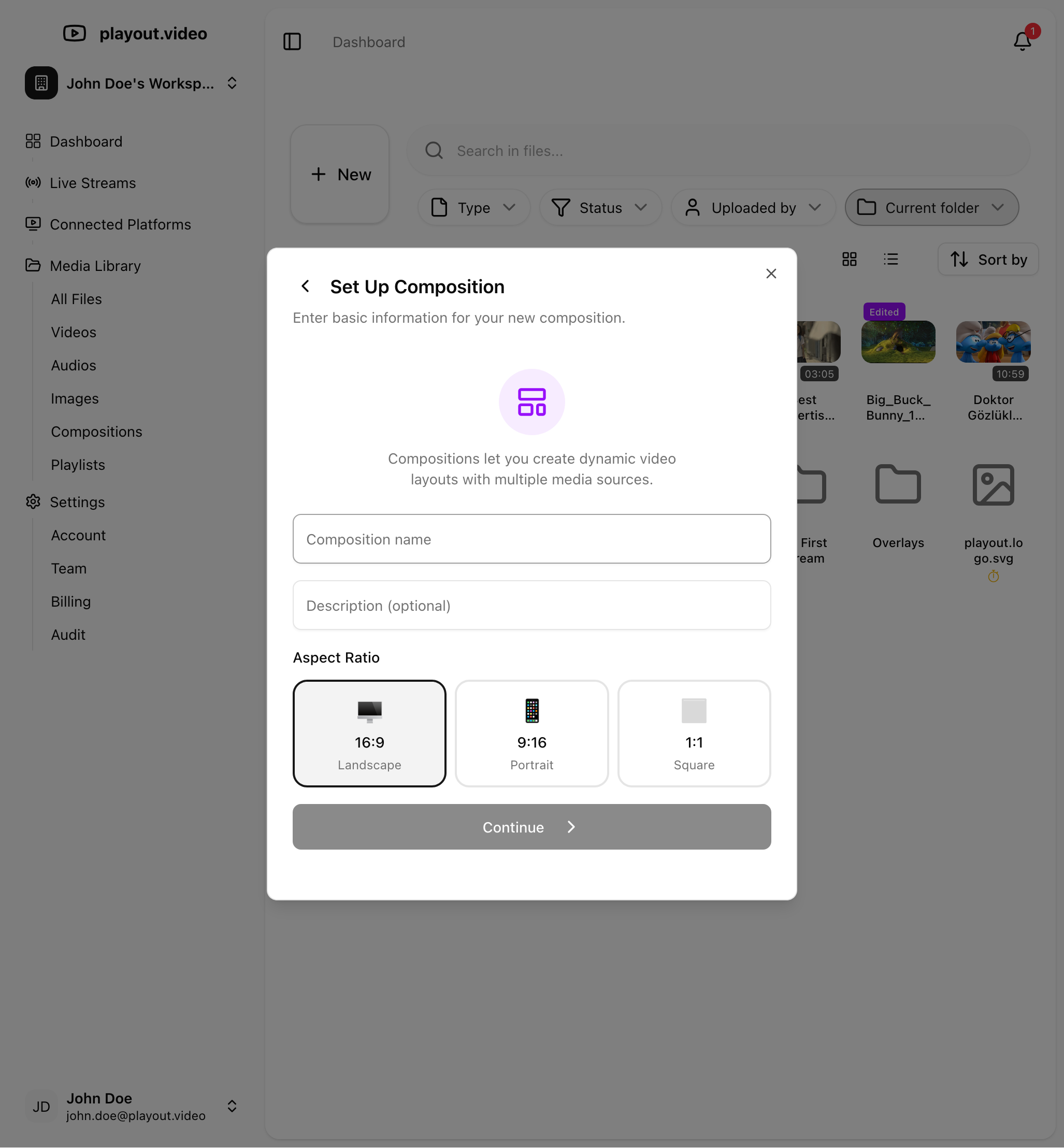 Compositions live in your media library just like videos. You can reuse them across multiple streams and playlists.