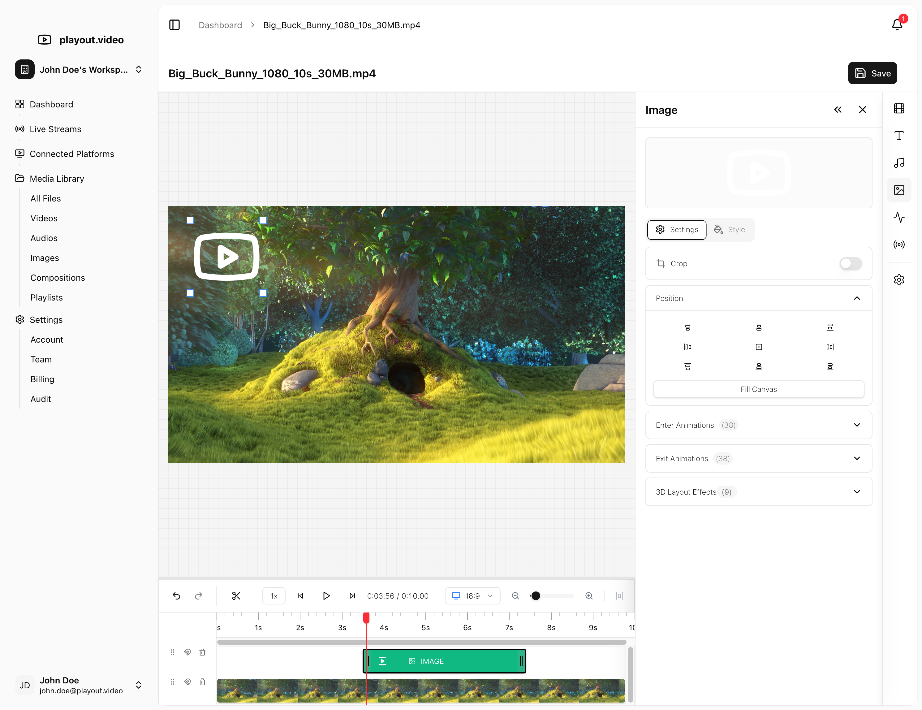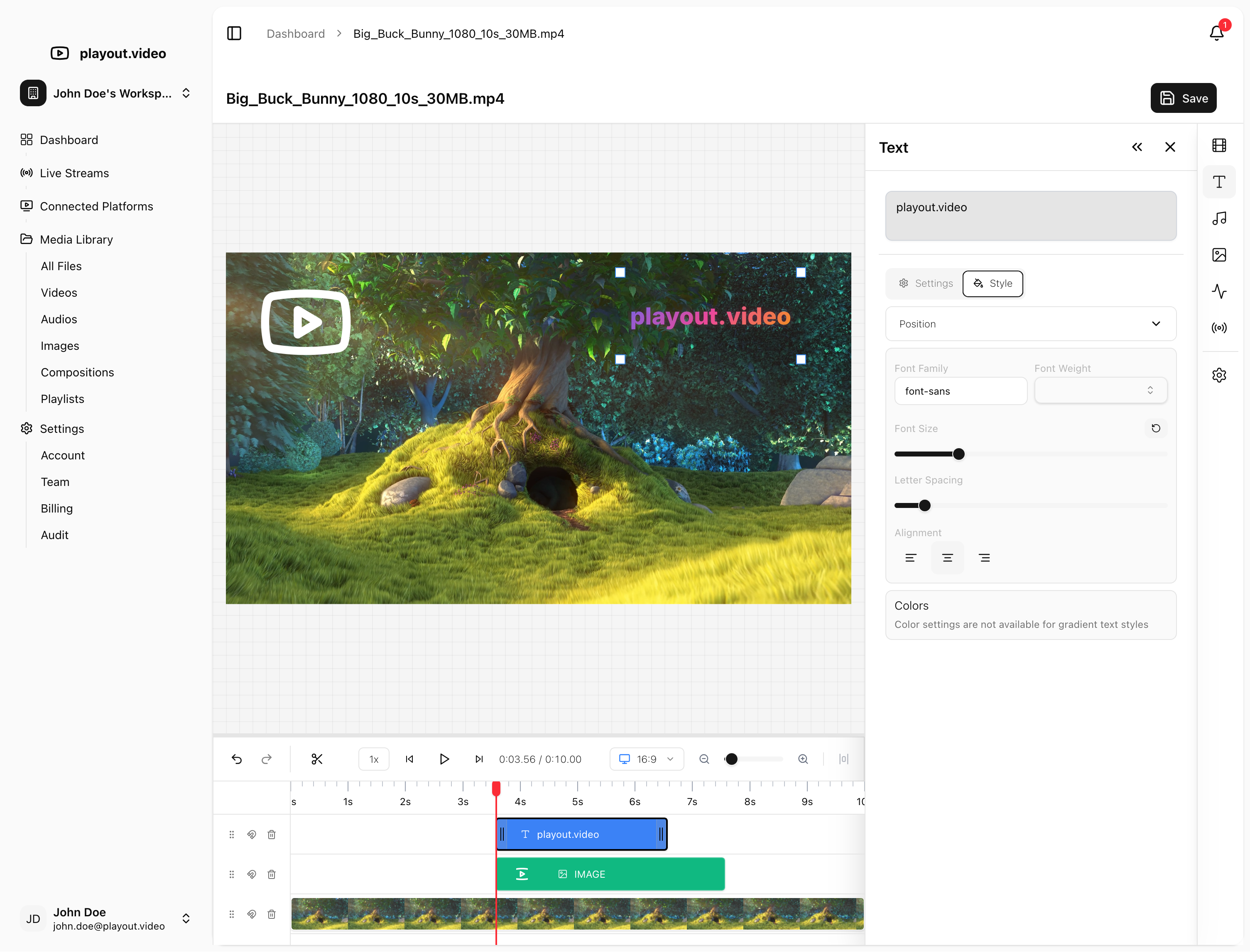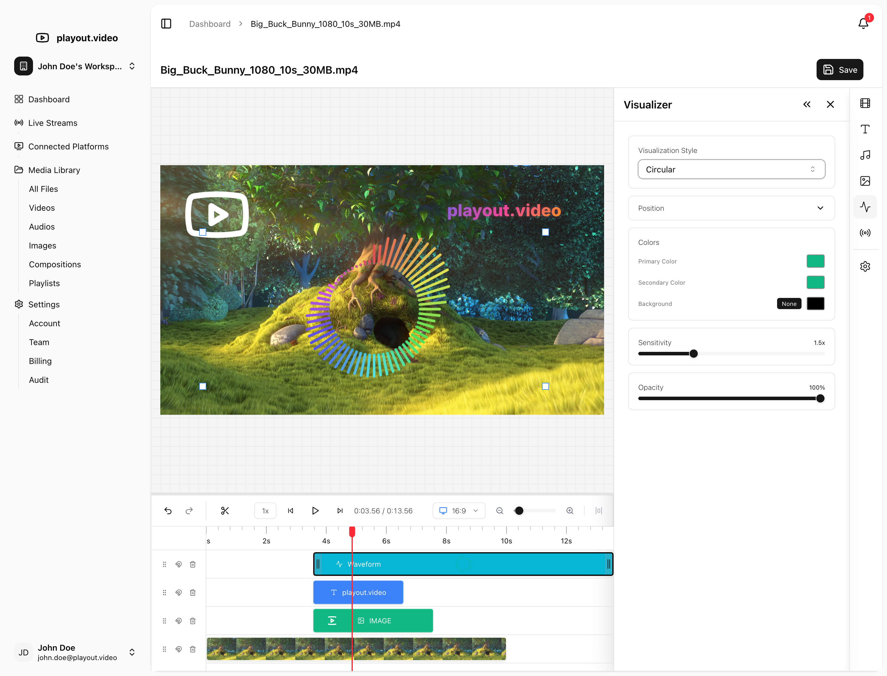 Add logos, text, captions, stickers, audio visualizers, and now-playing displays to your live stream using the playout.video composition editor.