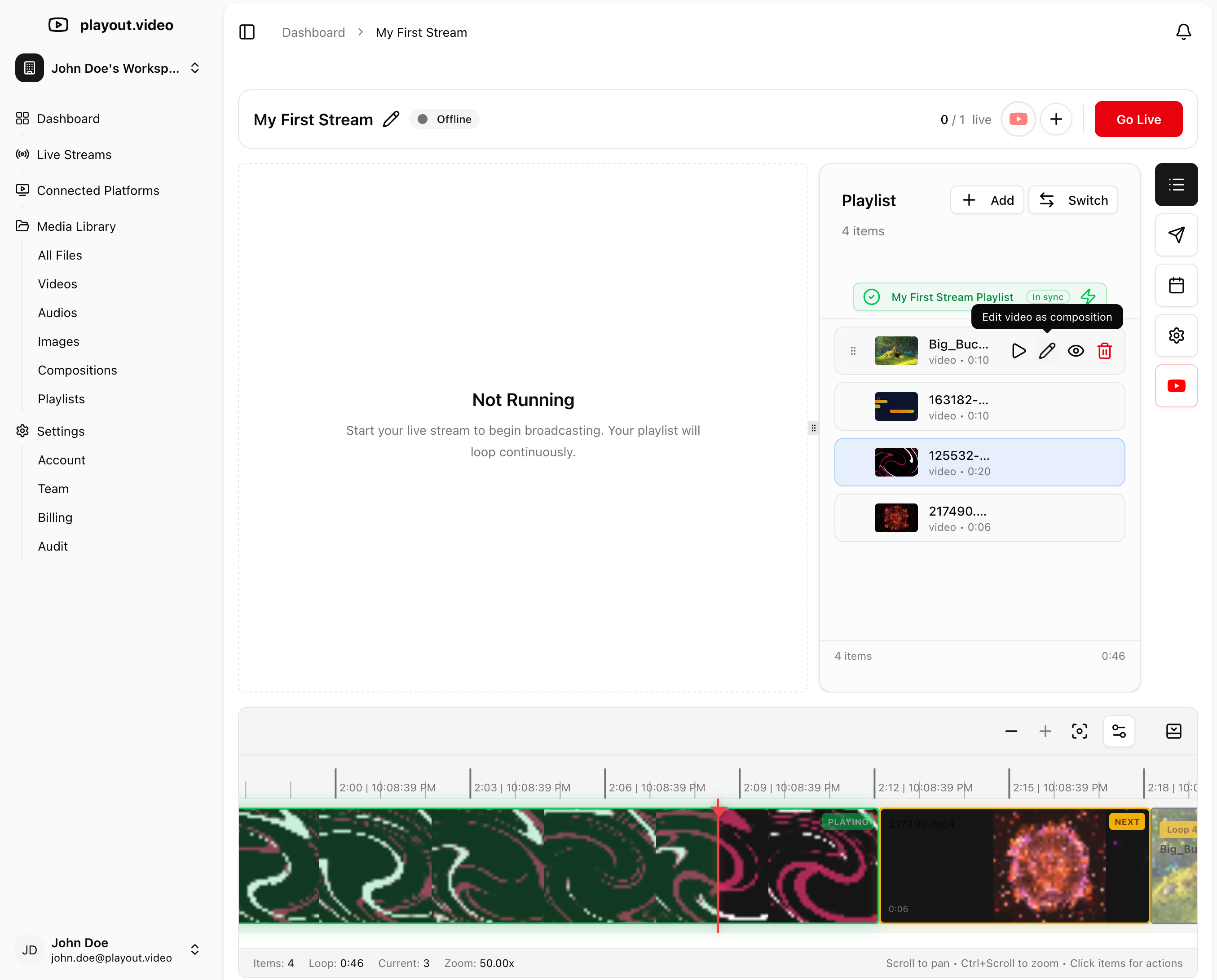 Compositions live in your media library just like videos. You can reuse them across multiple streams and playlists.